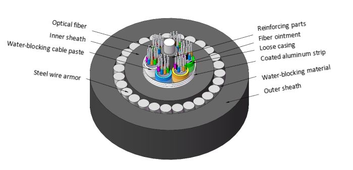 Struktura kabla optycznego polega na wprowadzaniu jedno- lub wielo-trybów włókien optycznych do luźnej rury wypełnionej wodoszczelnym związkiem z tworzywa sztucznego o wysokim module.W środku rdzenia kabla znajduje się metalowy element wzmacniającyObejmuje metalowe elementy wzmacniające, luźne warstwy typu wypełnienia, aluminiowo-polietylenową osłonę wewnętrzną, cienką okrągłą tarczę stalową,i polietylenową obudowę zewnętrzną do komunikacjiW przypadku niektórych rdzeni kabli optycznych wokół metalowego centralnego elementu wzmacniającego wytłaczana jest warstwa polietylenowej podkładki.Luźne rury (i liny wypełniające) są skręcone wokół centralnego elementu wzmacniającego, tworząc kompaktowe i okrągłe rdzeń kablaWnętrze rdzenia kable jest wypełnione związkiem blokującym wodę, a wewnętrzna osłona aluminiowo-polietylenowa jest wytłaczana.szczeliny są wypełnione związkiem blokującym wodę, a następnie powłoka polietylenowa jest wytłaczana w celu utworzenia kabla.