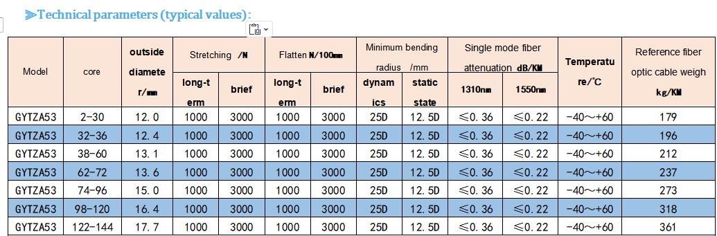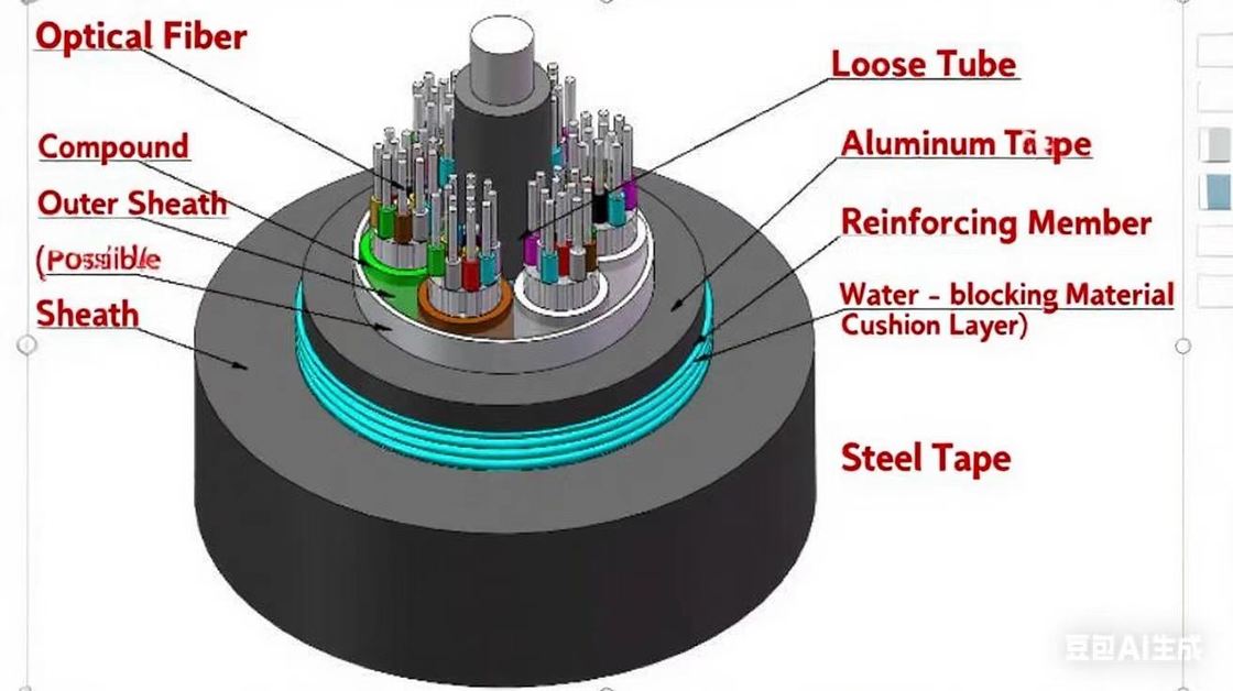 [Metalowy element wzmacniający, warstwa luźnej tulei całkowicie wypełniona, aluminiowa, ognioodporna, polietylenowa, klejona osłona wewnętrzna, opancerzenie taśmą stalową, ognioodporna, polietylenowa osłona zewnętrzna, zewnętrzny kabel światłowodowy do komunikacji] Konstrukcja kabla światłowodowego polega na umieszczeniu jednomodowych lub wielomodowych włókien światłowodowych w luźnej tulei z tworzywa sztucznego o wysokim module, wypełnionej wodoodpornym związkiem. Środek rdzenia kabla stanowi metalowy element wzmacniający. W przypadku niektórych kabli światłowodowych o określonej liczbie rdzeni, niemetalowy element wzmacniający centralny jest owinięty warstwą amortyzującą z polietylenu, a luźna tuleja (i lina wypełniająca) jest skręcona wokół centralnego elementu wzmacniającego, tworząc zwarty i okrągły rdzeń kabla. Szczeliny w rdzeniu kabla są wypełnione związkami odpornymi na działanie wody, a zewnętrzna wytłaczana aluminiowa, polietylenowa, klejona osłona wewnętrzna jest używana do opancerzenia taśmą stalową osłony wewnętrznej. Wypełniony związkami odpornymi na działanie wody, wytłaczany warstwą ognioodpornej, polietylenowej osłony zewnętrznej w celu utworzenia kabla.